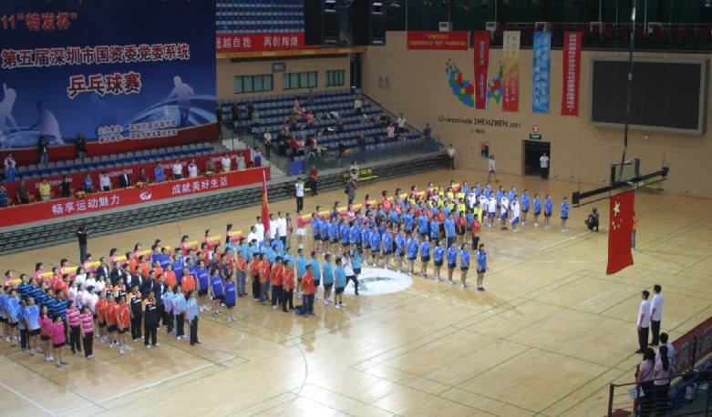 開幕式于10月29日上午8:30舉行。市國資委黨委書記柏立新,特發(fā)集團(tuán)黨委書記、董事長劉愛群、黨委副書記、總經(jīng)理施長躍,國資委黨辦主任李明、副主任張曉中、唐明通,以及國資委系統(tǒng)企業(yè)的領(lǐng)導(dǎo)出席開幕式。開幕式由集團(tuán)總經(jīng)理施長躍主持。此時的羅湖體育館一派歡快、濃烈的氛圍:主席臺正面高樹印有本次比賽徽標(biāo)和“2011‘特發(fā)杯’第五屆深圳市國資委黨委系統(tǒng)乒乓球賽”字樣的巨幅背景板,四周掛滿國資委和系統(tǒng)各企業(yè)的旗幟與祝比賽圓滿成功的條幅,以及“暢享運動魅力,成就美好生活”、“樹競技風(fēng)尚,展國企風(fēng)采”等標(biāo)語,各單位啦啦隊和觀眾坐滿看臺。伴隨著熱烈歡快的運動員進(jìn)行曲,來自國資委系統(tǒng)21家單位的22支代表隊,在美麗端莊的引導(dǎo)員帶領(lǐng)下,隨著高舉國資委旗幟的旗手、護(hù)旗手依次入場,隊員們意氣風(fēng)發(fā),精神飽滿,步伐矯健,隊列整齊。在全體起立奏唱國歌、莊嚴(yán)的升國旗儀式后,集團(tuán)董事長劉愛群和國資委黨委書記柏立新分別代表承辦方和組委會先后致辭。